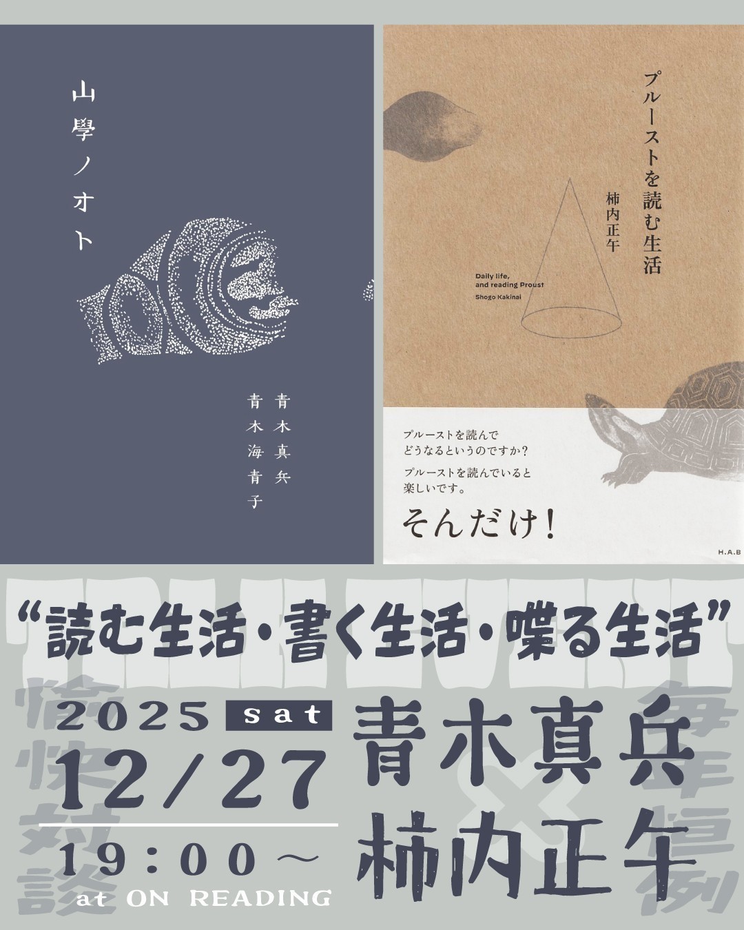 奈良県東吉野村で私設図書館「ルチャ・リブロ」を運営し、『手づくりのアジール「土着の知」が生まれるところ』や『つくる人になるために: 若き建築家と思想家の往復書簡』などの著者でもある青木真兵さんと、『プルーストを読む生活』(祝重版!)、『会社員の哲学 増補版』などの著者、柿内正午さんによる当店恒例のトークイベント。