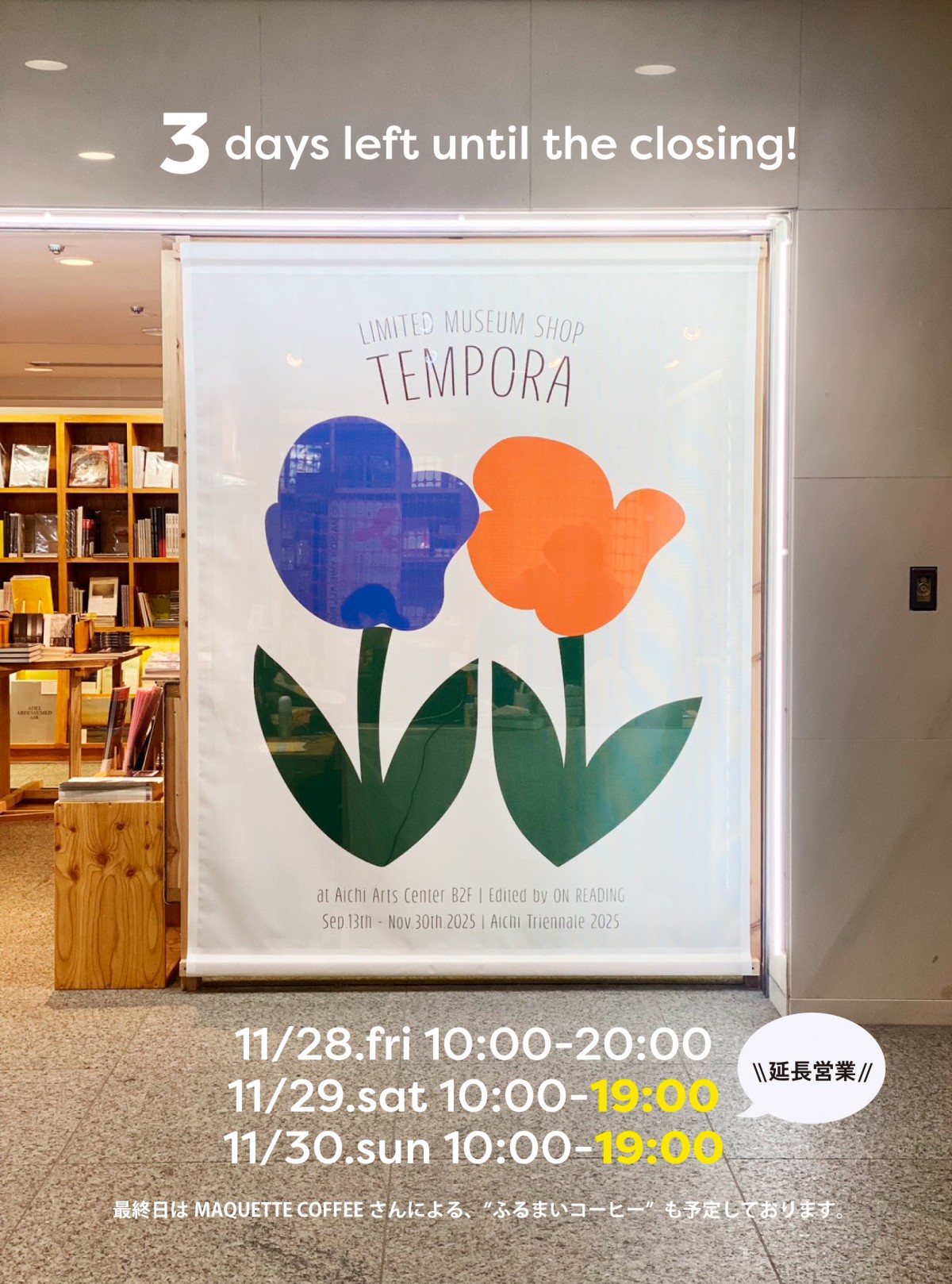 国際芸術祭「あいち2025」の開催にあわせ9月13日(金)より2ヶ月半の期間限定でオープンしているTEMPORAも、いよいよあと2日で閉店となりました。いや~~過ぎてしまえば本当にあっという間でしたね!毎週のように通って下さっていた方や、展示が変わる度、お弁当やPOP UPイベントの度にご来店下さる方もいて、短い間ながら皆さんの日常のお店になれたことがとても嬉しいです。もちろん、芸術祭の前後でお立ち寄りくださって「本の見え方が変わった」とか「ざわざわした心が落ち着いた」といった声もいただき、芸術祭とともにあるミュージアムショップとしての役割も多少なりとも果たせたのかな、と思います。
